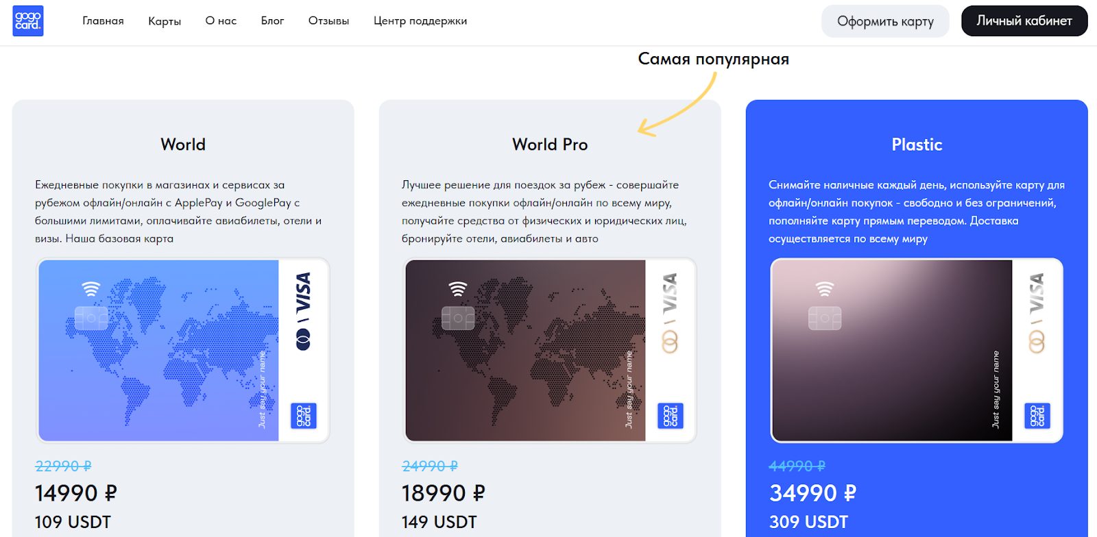 - World Pro – старшая версия от «ГогоКард», где лимиты шире, до $100,000 хранения и до $200,000 оборота. Заявлена как вариант для поездок и крупных покупок. Цена – ₽18,990.