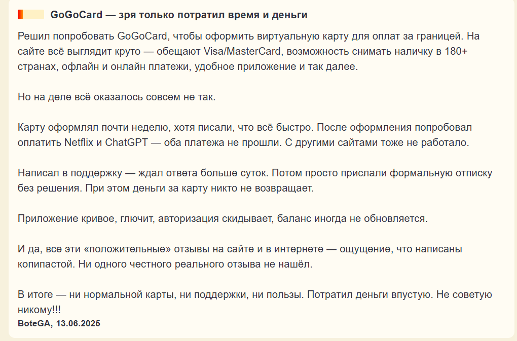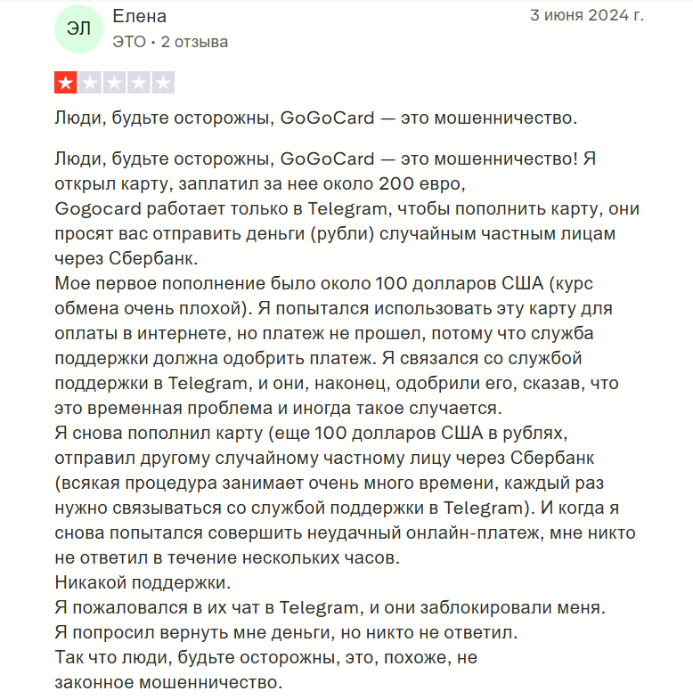 Встречаются также отзывы о GogoCard, где говорится, что это скам, а разработчики мошенники. Пишут, что они берут оплату якобы за открытие счета, выпуск карты и доставку физической версии, а также позволяют пополнять счет, однако платежи и вывод средств не удавались.