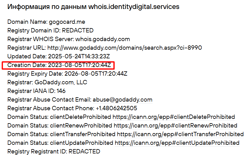 Годом основания управляющей компании GGC Technology Company Limited указывается 2022, однако по сервису Whois платформа функционирует с 2023. Имена и контактные данные владельцев сервиса скрыты и о них ничего не сказано на самом ресурсе. Есть лишь почта для связи – support@gogocard me.