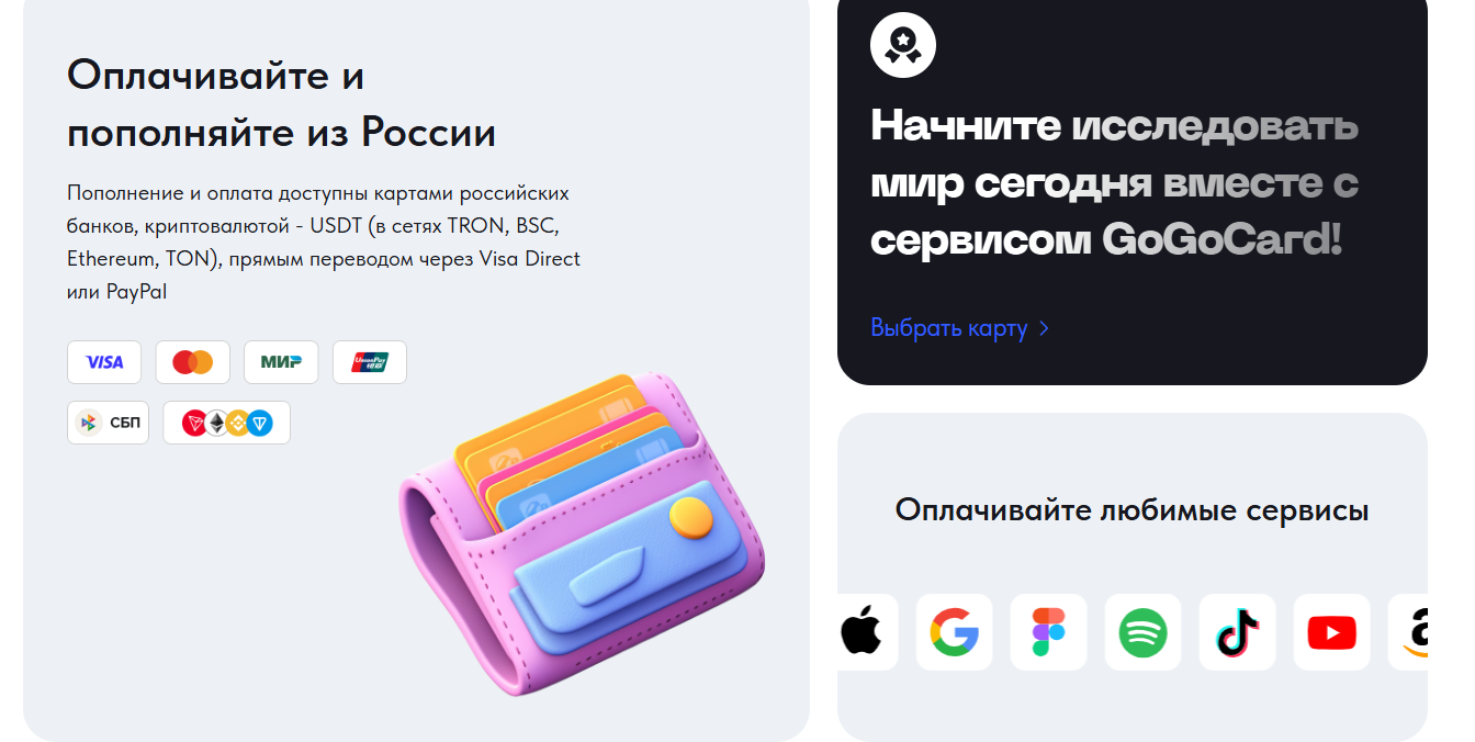 Совершать онлайн-покупки и пополнять предложенные карты предлагают прямо из РФ с помощью популярных платежных систем и криптовалюты. Следить за актуальными изменениями продуктов и курсов рекомендуют через телеграмм-ресурс «GoGoCard – новости (официальный канал)».