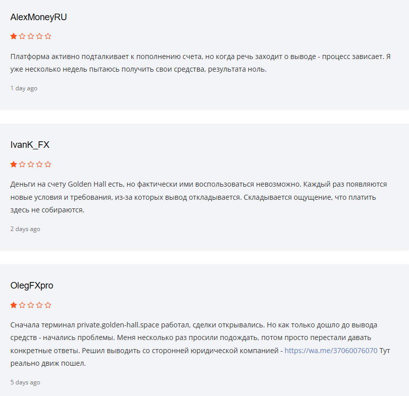 Баланс в аккаунте трейдера Golden Hall отображается корректно. Но воспользоваться деньгами невозможно. Каждая сделка на вывод зависает без объяснений. Связь с менеджерами пропадает. Номера телефонов перестают отвечать.
