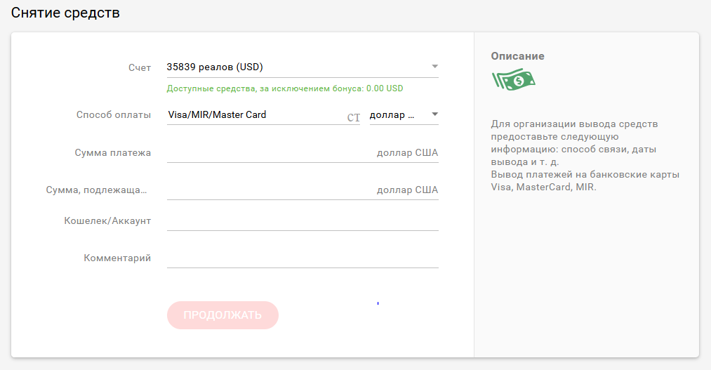 В платежах два подраздела – внесение средств и вывод. Для пополнения принимают карты Visa и Mastercard. При попытке вывести деньги система требует указать платежный способ, сумму и данные кошелька. Процесс выглядит стандартно.