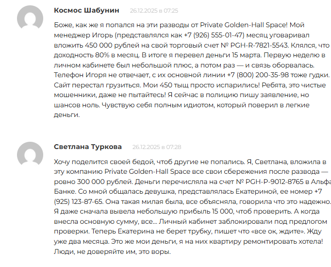 Отзывы о golden hall space указывают на системный развод. Главная жалоба – невозможность вывести прибыль со счета. Платформа активно стимулирует пополнение. Менеджеры обещают надежный заработок и быструю прибыль. Когда дело доходит до вывода, начинаются задержки. Деньги застревают в системе.