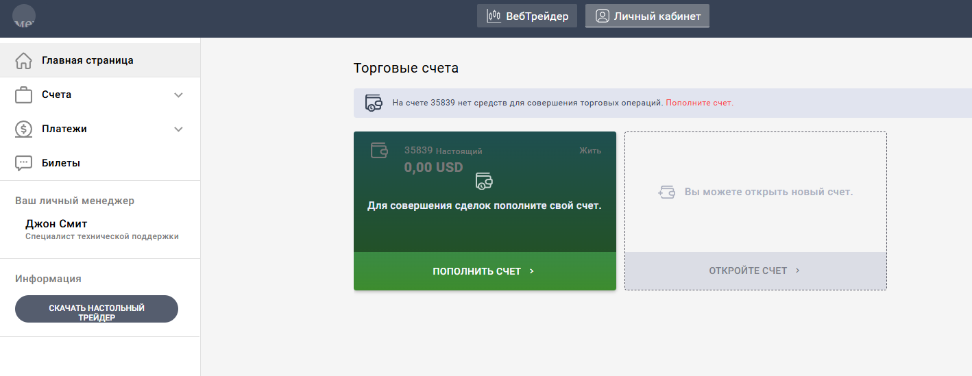 Каждому клиенту назначается личный менеджер. В терминале указан специалист техподдержки Джон Смит. Есть кнопка скачивания настольного трейдера для работы с платформой.