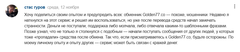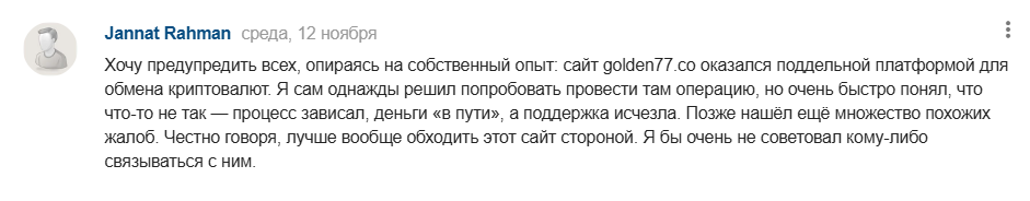 На странице обменника Golden 77 co есть только положительные отзывы, где люди рассказывают о постоянном использовании проекта, быстром обмене и хорошем курсе. Однако на тематических форумах можно заметить лишь негативные упоминания площадки. Там люди отмечают, что Golden77 это поддельная биржа, где невозможно продать крипту, а после отправки средств техническая поддержка начинает требовать дополнительные платежи или просто блокирует счет.