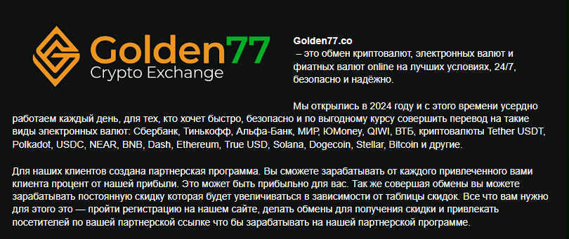 На сайте Crypto Exchange Golden77 co команда называет себя надежным обменником и среди своих преимуществ называет большое количество электронных активов, однако на деле продать можно только крипту. Обмен в другую сторону на странице невозможен, а все слова о надежности, скорости и безопасности платформы пустые выдумки. В качестве гарантий разработчики перечисляют своих партнеров, где есть такие крупные агрегаторы, как BestChange, ExchangeSumo и другие, но у них на платформе о данной конторе нет никаких сведений. Это означает, что никакого рода сотрудничества между ними нет.