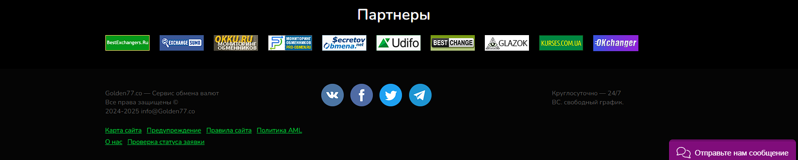 Обменный пункт крипты, Golden77 co, был зарегистрирован в начале 2024 года. Команда разработчиков, как это часто бывает среди сомнительных и скам площадок, сохраняет анонимность. Из контактов есть лишь аккаунт технической поддержки в телеграм, GoldeSupport, и почтовый адрес info Golden77 co. На главной странице есть некоторые ссылки на социальные сети, типа Twitter и Вконтакте, но они нерабочие. Никаких каналов у команды нет, поэтому получать информацию об актуальных изменениях / курсах обмена невозможно.