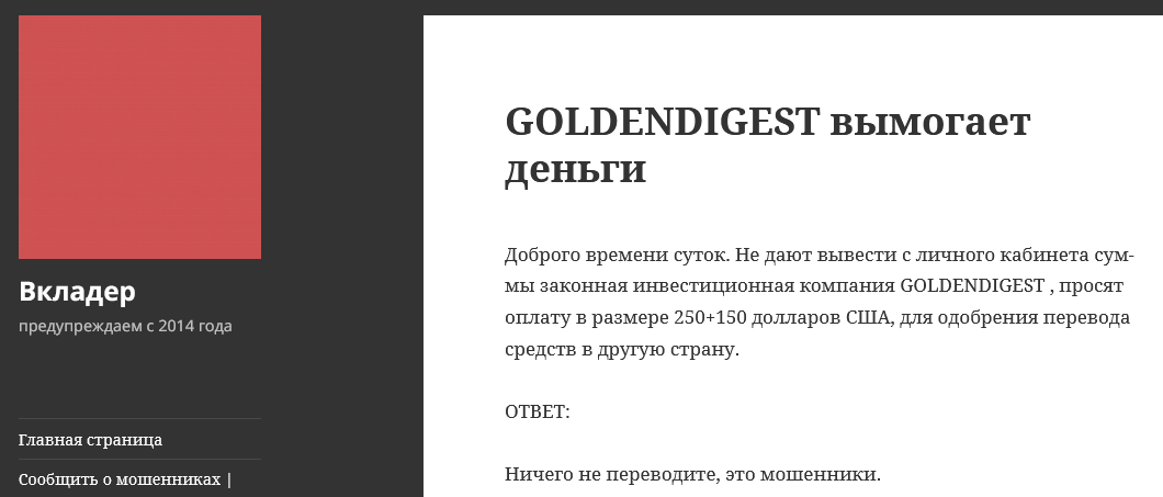 Полноценных отзывов на Goldendigest Ltd в интернете нет, упоминания тоже практически отсутствуют. Но на Вкладере администрация сообщила, что это мошенники.