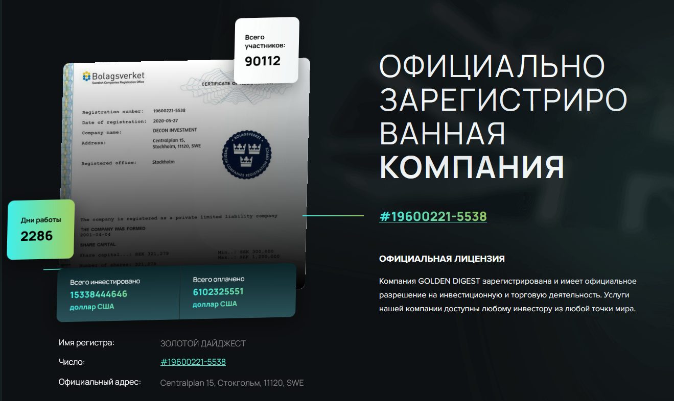 Goldendigest Ltd — так называют свою компанию разработчики зарубежной инвестиционной платформы. В данной статье мы проверим все ее данные на прозрачность и достоверность. Это поможет разобраться, заслуживает ли площадка доверия или это очередной скам.