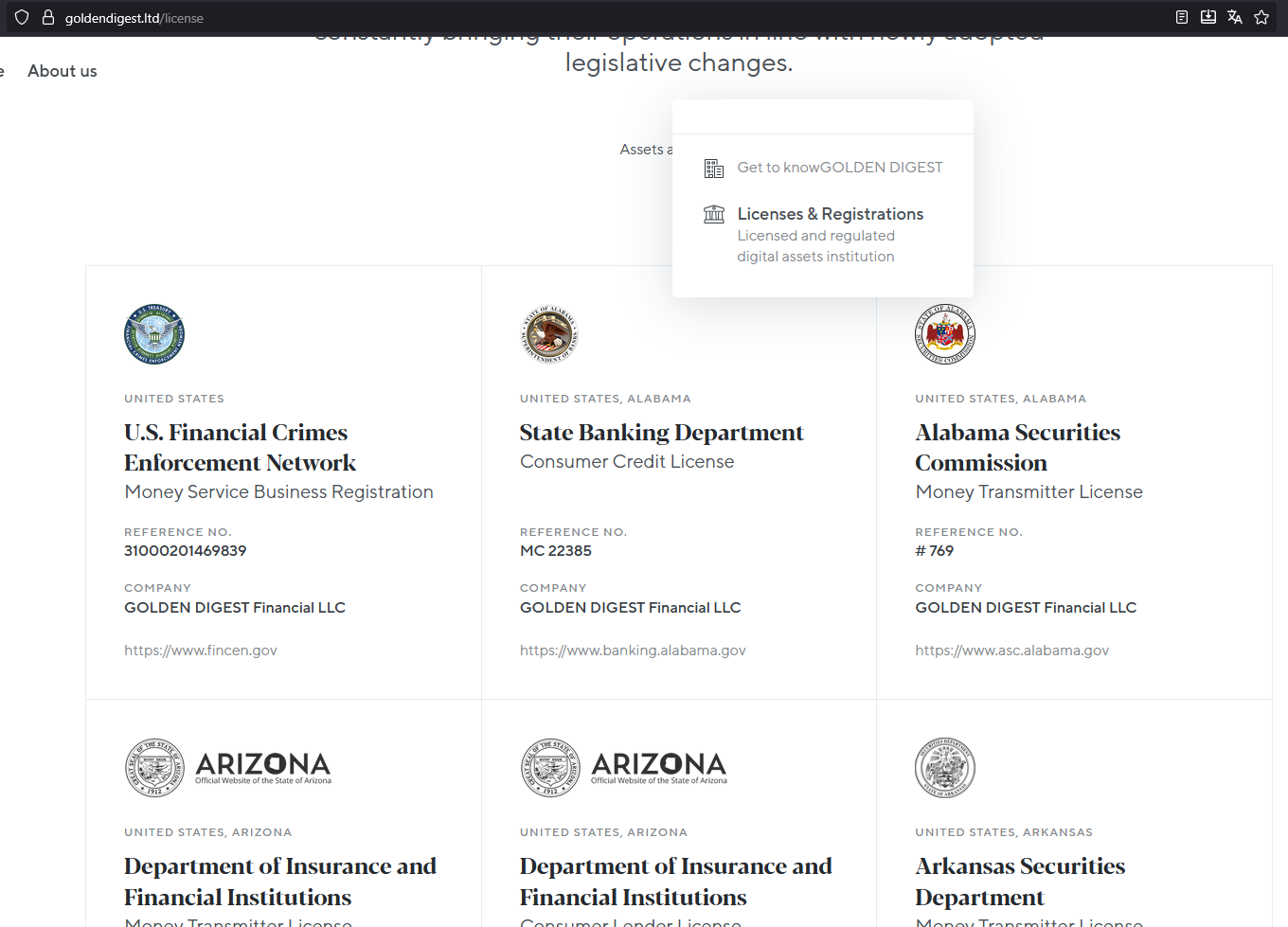 Официальный сайт Голдендиджест Лтд зарегистрирован 23 сентября 2025 года. Однако разработчики указывают другие даты, причем разные: в футере сайта это 2018, в разделе «О нас», а на скриншоте якобы зарегистрированной организации — 2020.