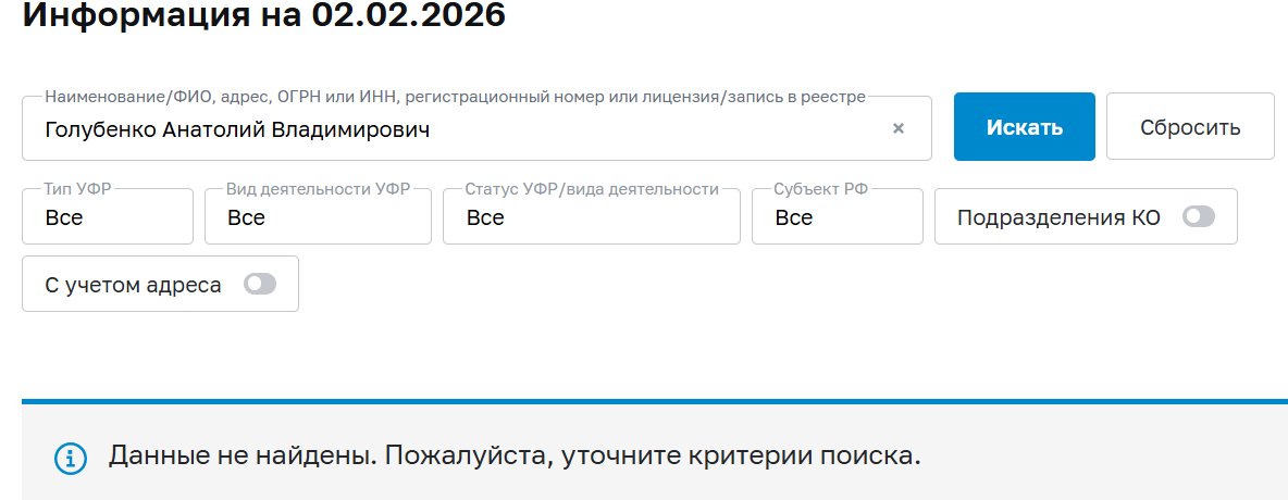 Ни у Голубенко Анатолия Владимировича, ни у его ИП, ни у АО нет лицензии от Центрального Банка России. Получается совместным инвестированием он занимается, вероятно, в обход закона.
