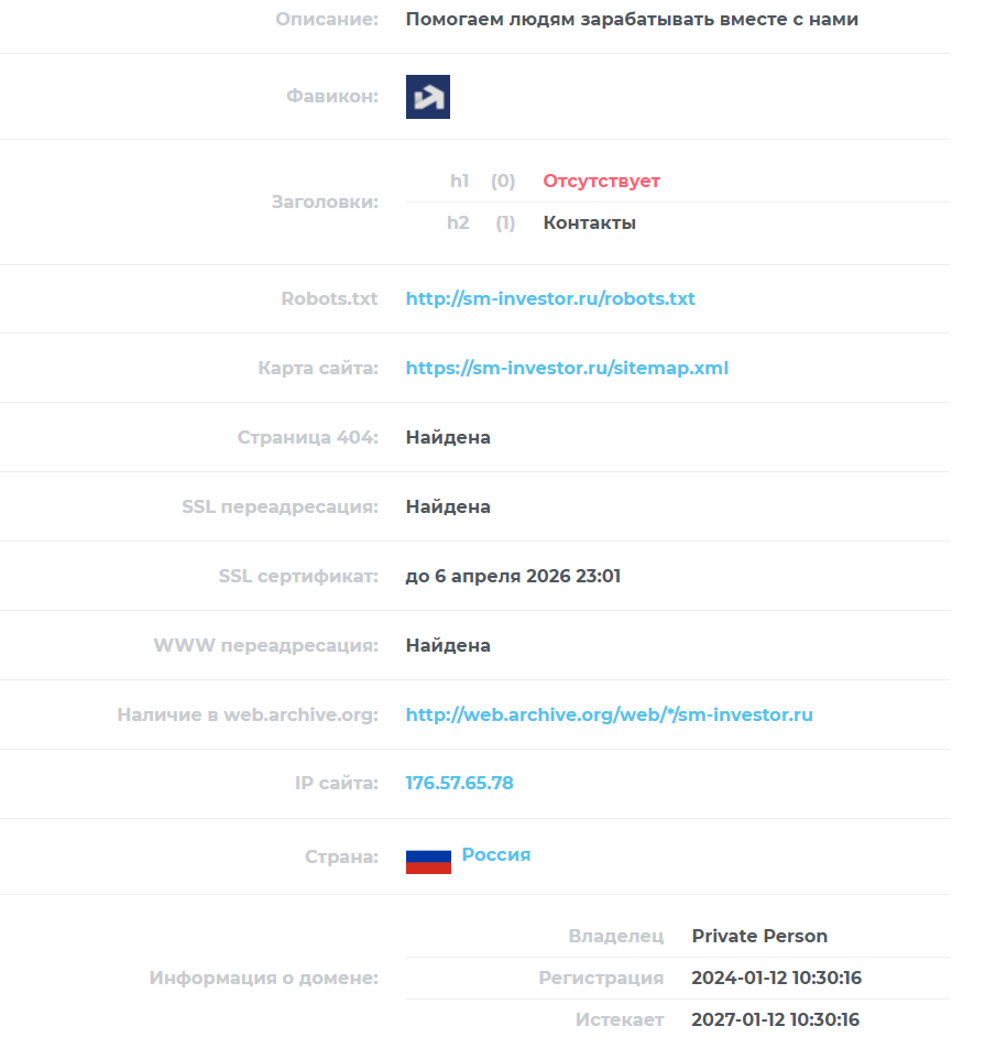 Домен зарегистрирован в январе 2024 года. Тогда же начала действовать компания. Сертификат продлен только на год, это может говорить о небрежности со стороны владельцев, а может – что слишком долго на этой площадке они оставаться не собираются.