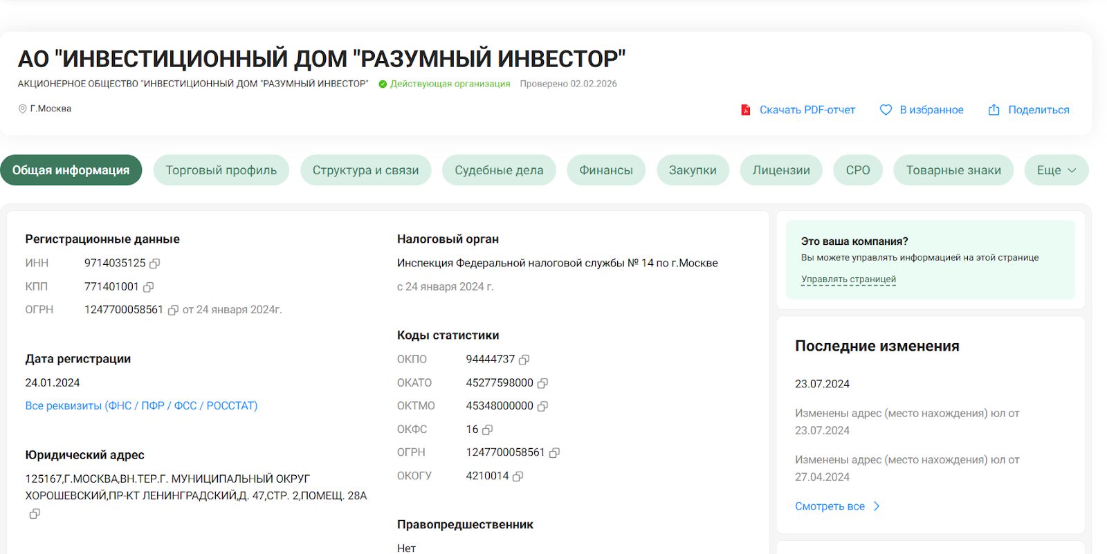 АО «ИНВЕСТИЦИОННЫЙ ДОМ «РАЗУМНЫЙ ИНВЕСТОР»» Голубенко, а не ООО, как без отзывов можно было бы предположить, существует только с 24 января 2024 года. И по официальным юридическим документам предшественников у него нет. Хотя Голубенко Анатолий Владимирович также был в разное мнения учредителем ООО «СЕЛИГЕР», ООО «ВАРБИО» и ООО «ПРОМСТАЙЛ» – последнее ликвидировано и исключен из ЕГРЮЛ из-за недостоверности сведений.