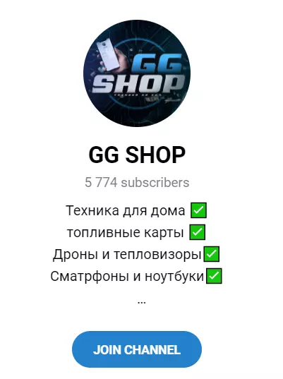 Gg Shop — интернет-магазин занимающийся продажами техники для дома, электроники и топливных карт. Он функционирует в мессенджере Телеграм и имеет более 5 тысяч подписчиков. В сети у него нет успешной репутации.