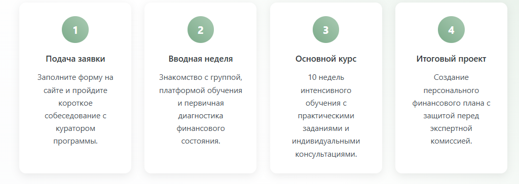 Для подключения к обучению необходимо подать заявку путем заполнения формы на сайте. После этого проводится ряд вводных занятий для оценки финансового состояния. На следующем шаге открывается доступ к основному курсу. После его завершения формируется план, который проверяется экспертной комиссией.