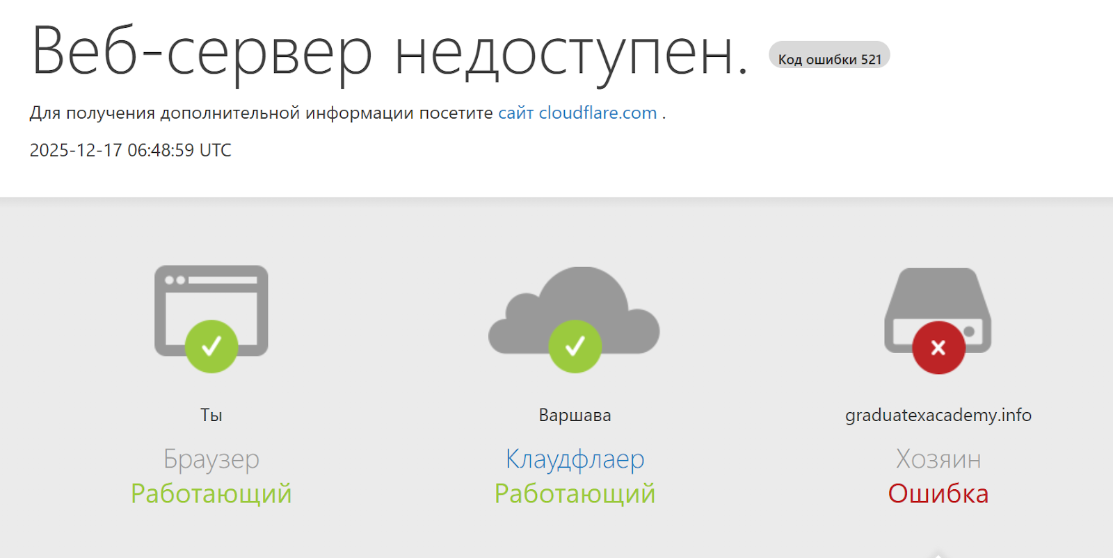 До недавнего времени проект был доступен по ссылке GraduatexAcademy Info. Именно здесь представители компании рассказывали об условиях сотрудничества, тарифах и структуре обучения. На середину декабря 2025-го платформа уже не доступна. При попытке входа на сайт появляется ошибка. При этом не понятно, является ли такая проблема постоянной или носит временный характер.