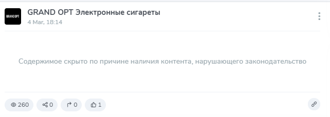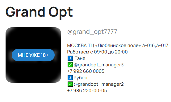 Если судить по названию, создатели сообщества Grand Opt занимались продажами электронных сигарет. Однако в марте 2026 года мы видим, что практически все публикации этого блога скрыты из-за « контента, нарушающего законодательство». Давайте выясним, продолжает ли функционировать канал «Гранд Опт», есть ли смысл на него подписываться и пользоваться услугами администраторов.