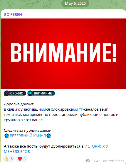 Чтобы «выжить» под запретами, владельцы сообщества Grand Opt7777 создали несколько запасных групп в Телеграм. Однако все они, похоже, прекратили свое существование так же, как и основная. Например, в блоге GO PEREH последняя запись датирована маем 2025 года. В ней автор публикует ссылку на «резервный канал», но та не отображается. Видимо, модераторы вычистили ленту, удалив незаконный контент.