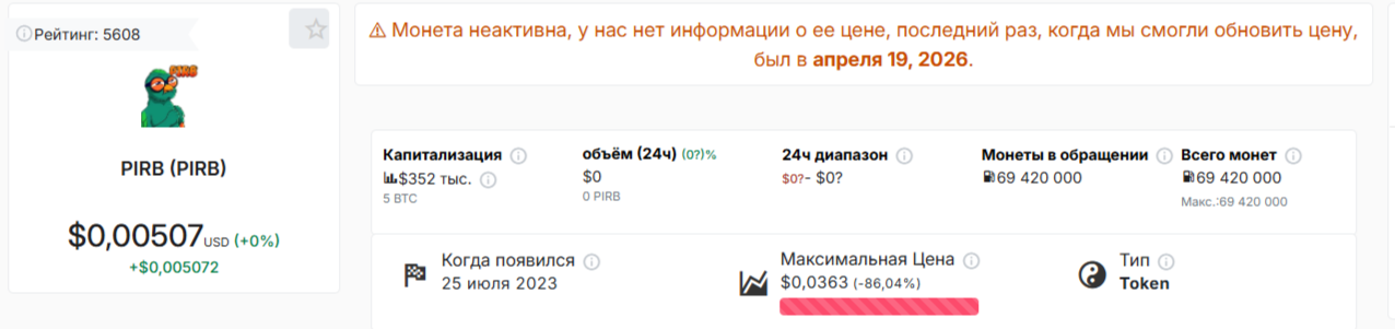Потенциальной причиной для остановки работы бота «Грин Памп» может быть и неактивность монеты. На момент проверки токен PIRB не торгуется на криптовалютных биржах.