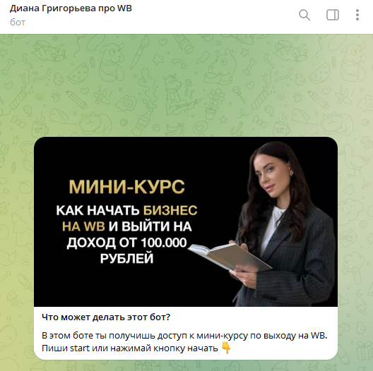 Активность проекта сосредоточена на нескольких площадках. В Telegram она общается через бота. В аккаунте «diana grigoreva bot» распространяются бесплатные мини-курсы. Они служат «воронкой» для продажи основных дорогостоящих пакетов обучения.