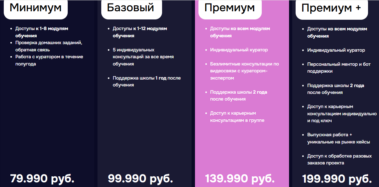 На официальном сайте проекта Wild Skills указана стоимость курсов в разделе «Тарифы». На основе условий оферты и рыночных данных представлены 4 типа планов обучения. Стартовать можно от суммы около 80 тыс руб.