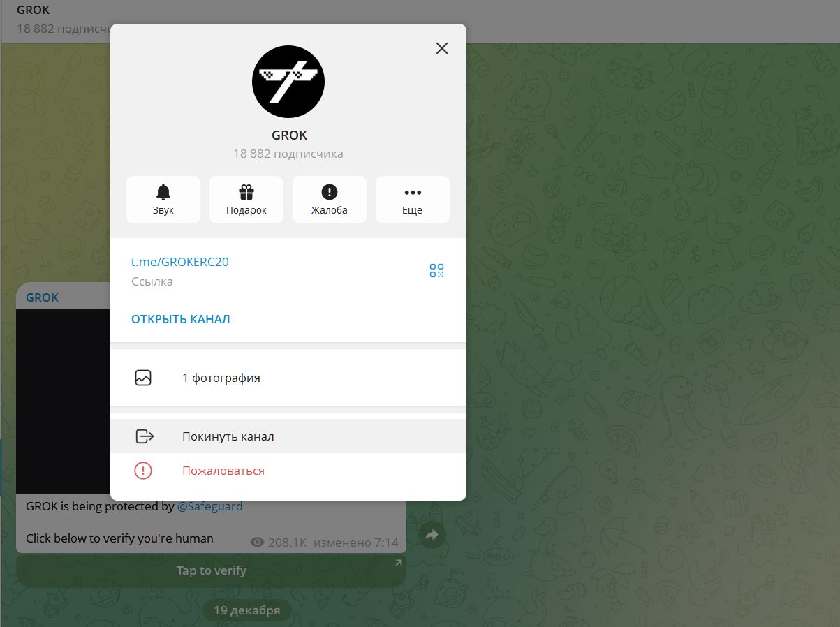 В ТГ есть несколько каналов сообщества. Основной официальный канал GROKERC20 насчитывает насчитывает 18 882 подписки, интерес невысокий. Купить мемкоин можно через чат-бота с авторизацией на Safeguard.