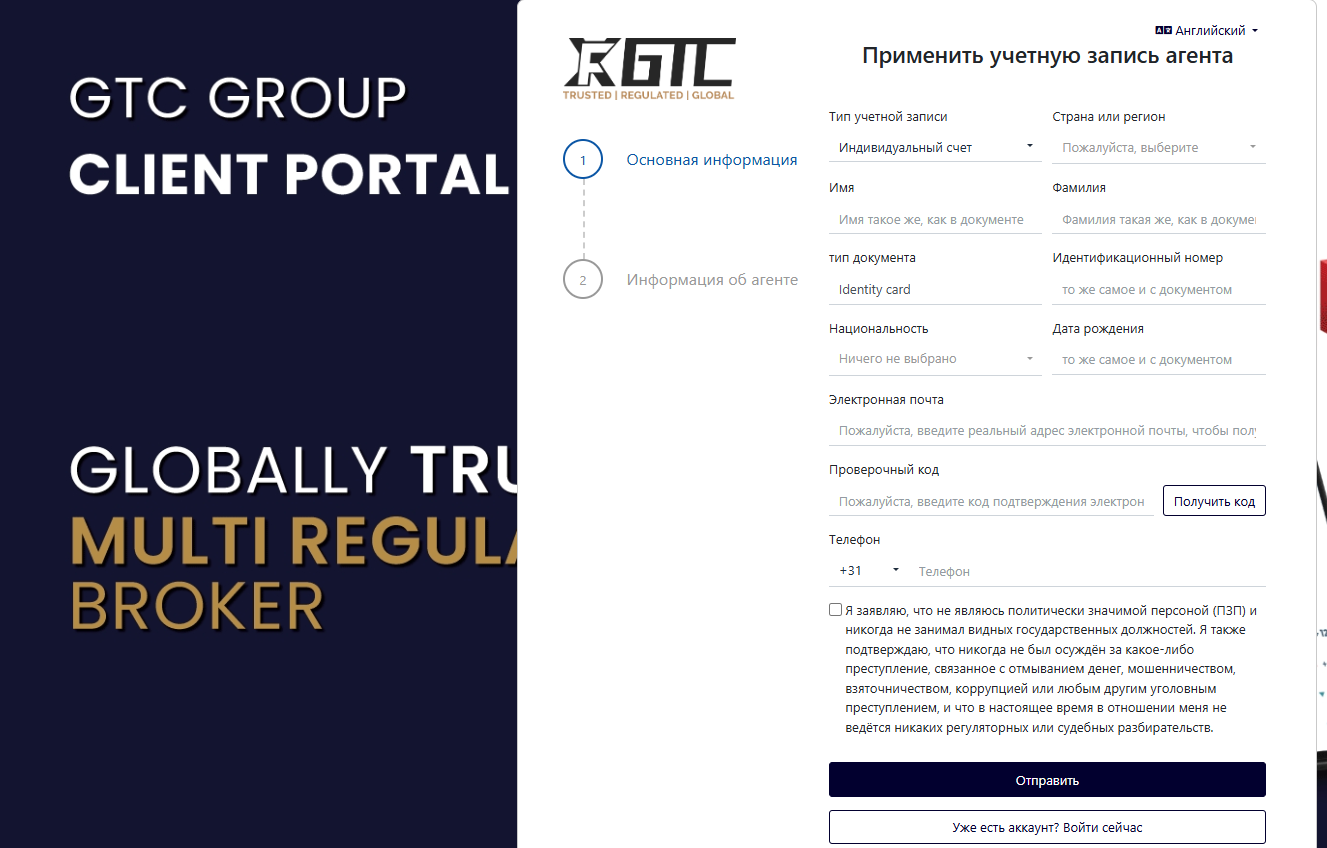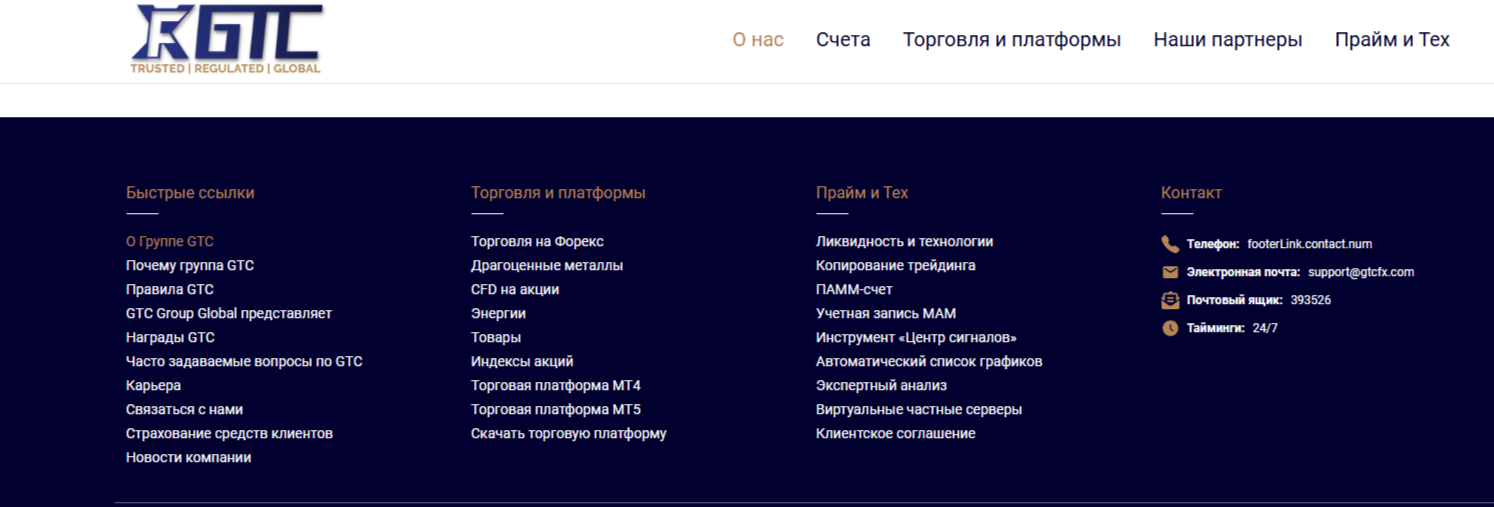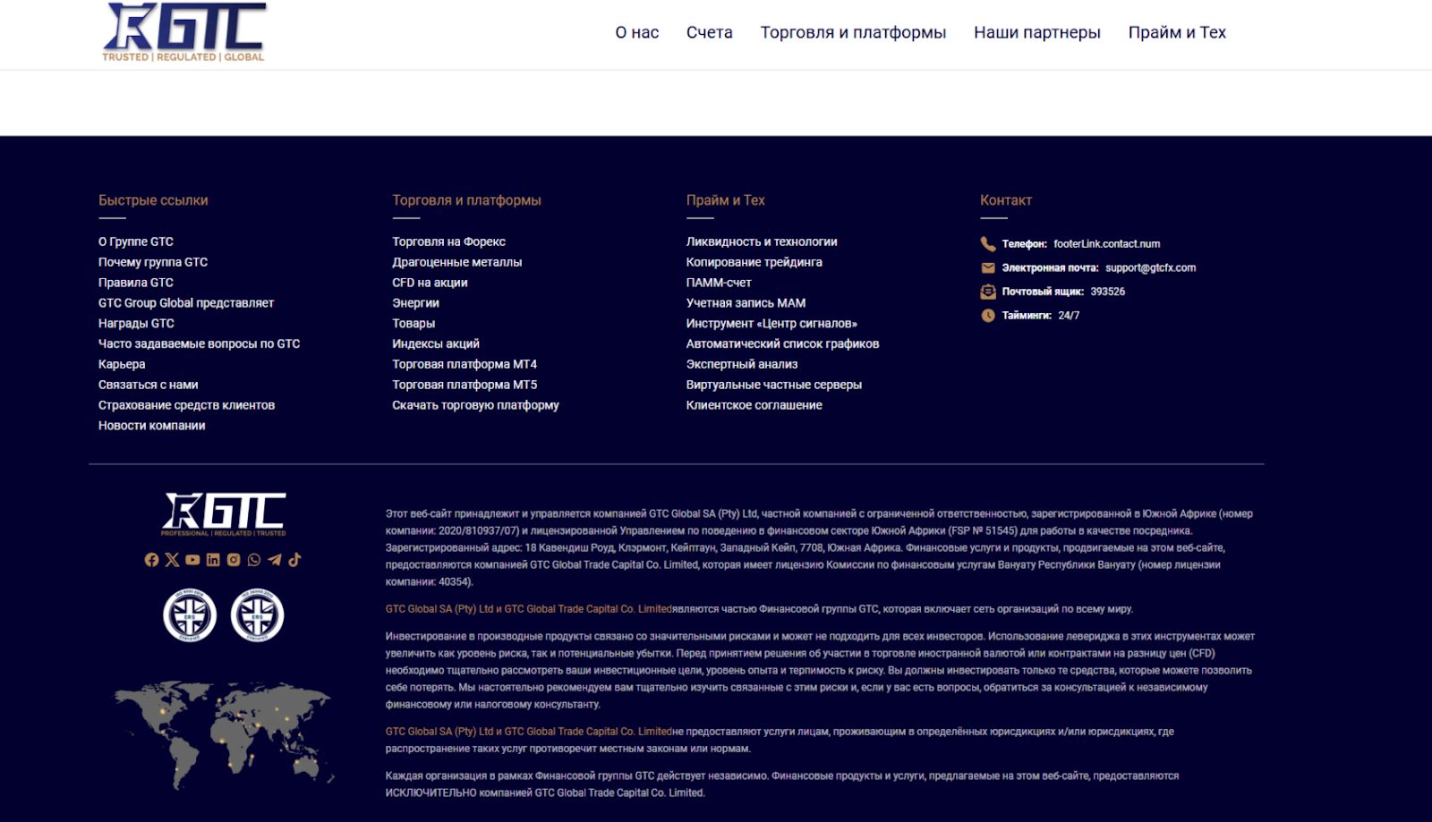 Брокерский портал отличается стильным современным оформлением, простой навигацией, интуитивно понятным интерфейсом. На первый взгляд можно подумать, что веб-сайт содержит много полезной информации. Так вкладка «О нас» знакомит читателей с группой компаний GTC GROUP: GTC Group Markets Update, GTC Global SA Pty Ltd и GTC Global Trade Capital Co Limited. Данными компаниями с 2012 года якобы регулируется деятельность посредника. Брокер на словах имеет лицензии Маврикия и Вануату. Официальный адрес брокерской организации: 18 Кавендиш Роуд, Клэрмонт, Кейптаун, Западный Кейп, 7708, Южная Африка.