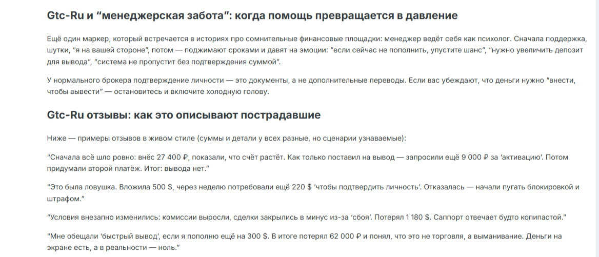 За скромное время своего существования фейковый брокер не получил от трейдеров ни единого благоприятного комментария. Никто из участников рынка не выразил желания похвалить сайт gtc ru com за отличные комиссионные сборы, безопасность и прозрачность платежей, высокий доход, быстроту сделок и т. п.