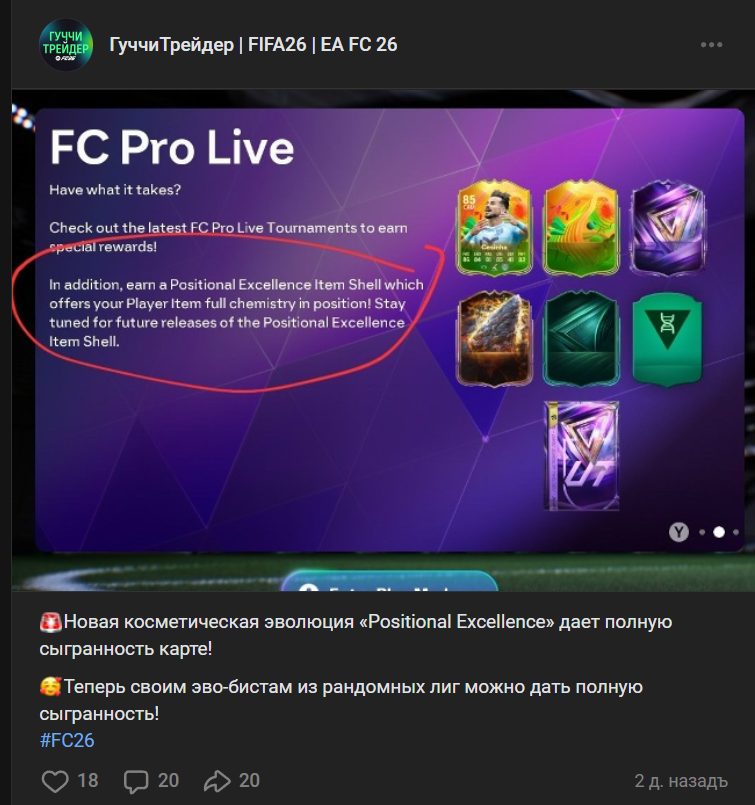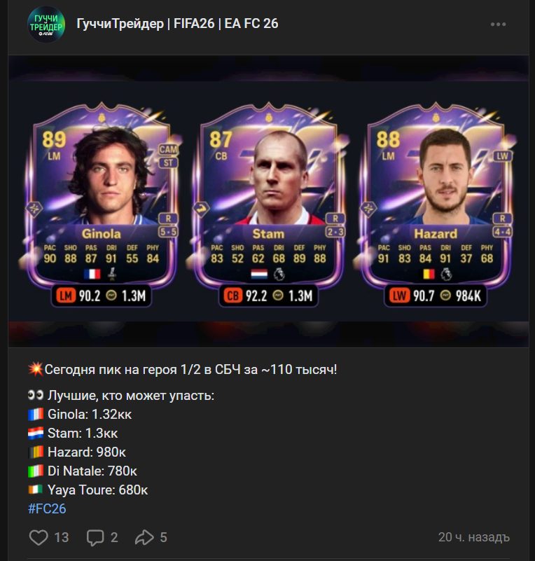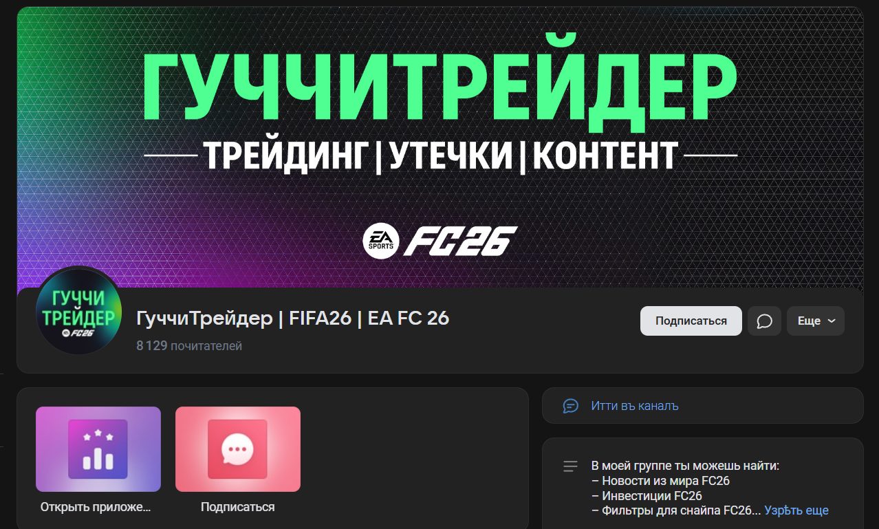 В бесплатной группе ВКонтакте Guccitradereafc пользователи могут узнать новости из сферы FC 26. Также автор рассказывает об инвестициях, приводит примеры карточек и иных активов, которые можно получить и продать. Подписчикам рассказывают о фильтрах для снайпа. Здесь тоже охватывается тема трейдинга в рамках игры. Группа позиционируется как полезное и при этом дружелюбное сообщество любителей FC26, где активные игроки смогут найти для себя много нового.