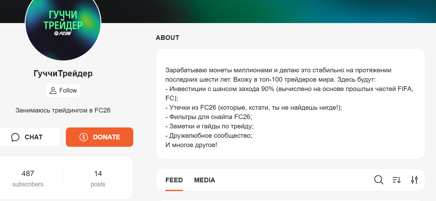 Основная тема, с которой связана деятельность ГуччиТрейдер – FIFA26 EA FC 26. Трейдер утверждает, что зарабатывает миллионы внутренних игровых монет. Этим он занимается в течение последних 6 лет. Также он утверждает, что входит в ТОП-100 трейдеров в данной сфере. Условно его предложения для подписчиков можно разделить на 2 основных направления. Первое представляет собой бесплатный канал, в котором подписчикам предоставляется контент, имеющий отношение к игре. Второе связанное с тем, что он предлагает за подписку.