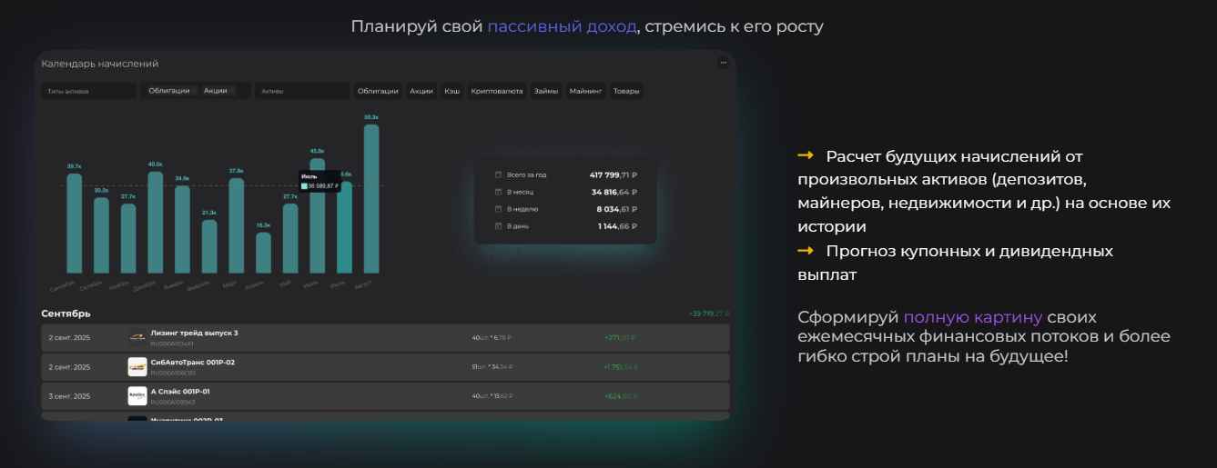 Опции приложения включают планирование пассивного дохода. При этом пользователь сможет рассчитать будущие начисления от выбранных активов на базе их истории, таким образом, принимая решение о потенциальных вкладах.