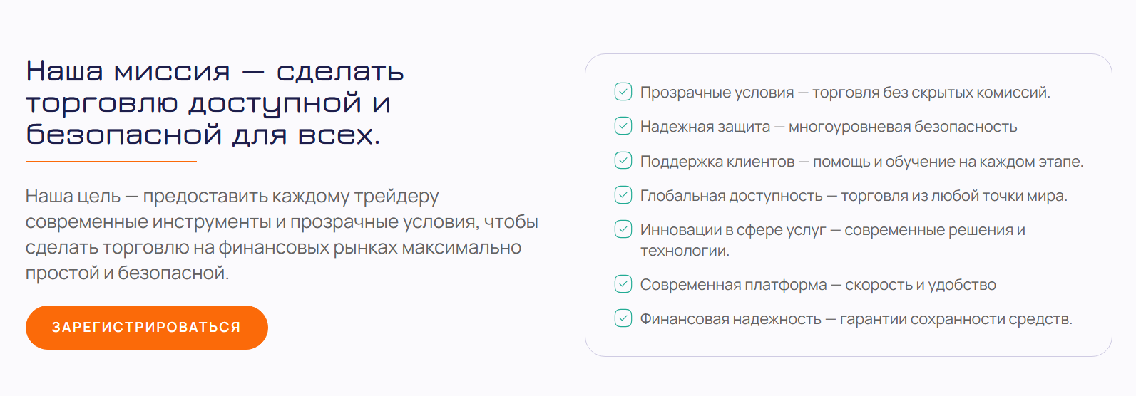 Он обещает клиентам прозрачные условия трейдинга, быстрое исполнение ордеров, передовые технологии и высокий уровень безопасности финансовых транзакций.