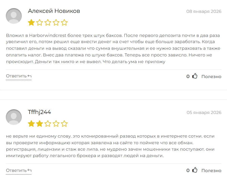 Отзывы о брокерской площадке harborwindcrest top, harbor windcrest net в сети отрицательные. Трейдеры жалуются, что не могут вывести доход, брокер требует с них налоги и прочие сборы.