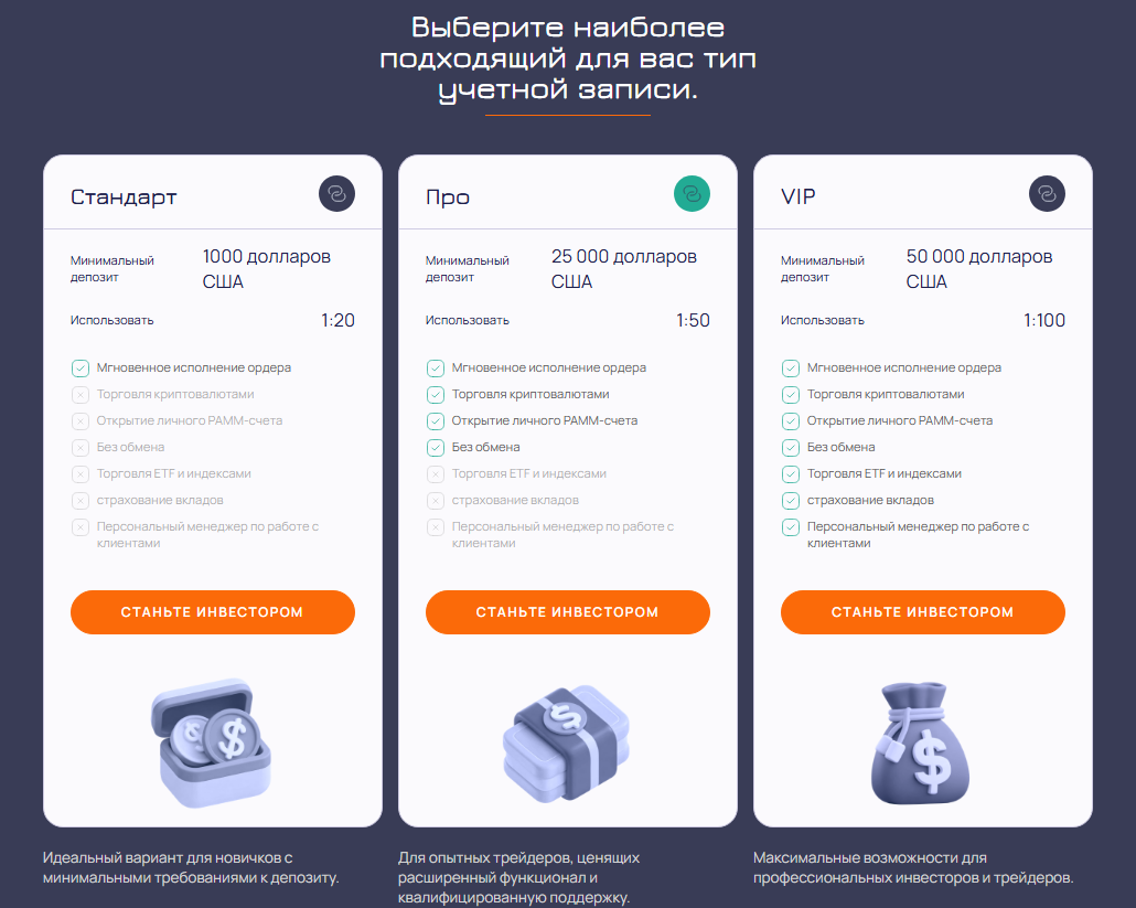 - «Стандарт»: депозит от $250, кредитное плечо 1:20. Недоступны криптовалюты, ETF, индексы, PAMM-счета. Взнос не подлежит страхованию. Не предоставляется круглосуточная техподдержка.