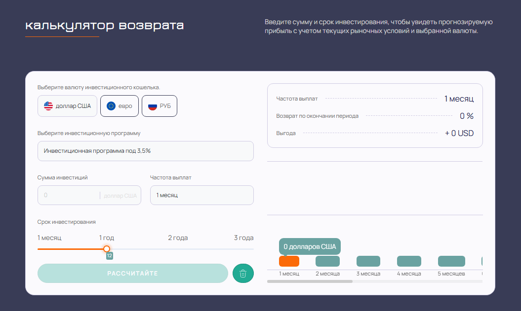 Дополнительно брокер предлагает инвестиции. Программа похожа на обычный банковский вклад. Доходность – 3,5% годовых. Срок – от месяца до 3 лет. Доступные валюты: рубли, евро и доллары. Подробной информации об инвестиционной программе нет. В какие активы предлагается вкладывать средства, неизвестно. Возможно, в те, что представлены для трейдинга.