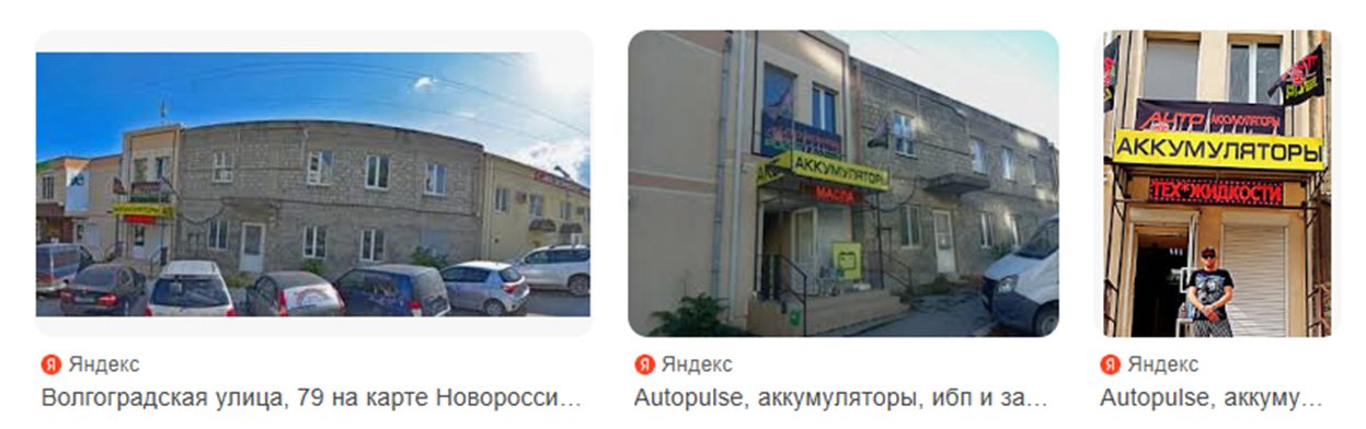 Далее проверяем адрес – Новороссийск, ул. Волгоградская, 79. И Яндекс карты выдают нам фото небольшого здания в котором располагается такой же небольшой магазин аккумуляторов и техжидкостей. Ничего общего с Hard motorzz на картах нет.
