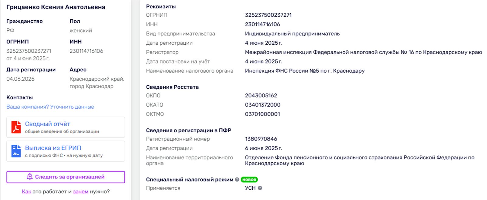 Проверку безопасности начнем с подтверждения легальности ИП Грицаенко К.А. И такое юрлицо действительно существует и даже совпадает ОКВЭД – продажа автозапчастей. Но вот только на учет оно было поставлено только летом 2025 года, получается до этого магазин работал нелегально.