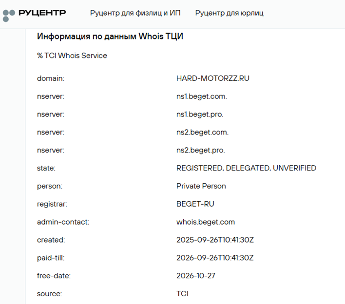 Проверка возраста сайта также показывает неутешительные результаты. Домен был запущен в сентябре 2025 года и права выкуплены на минимально возможный срок.