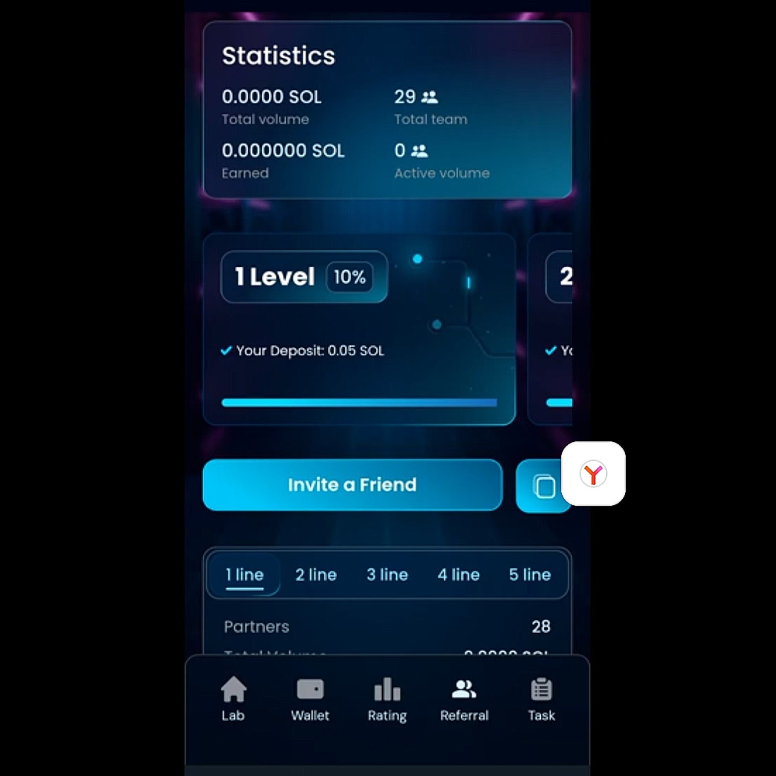 Пользователям была доступна партнерская система, и за партнеров 1-го уровня обещали 10%. Однако при этом вложение должно было быть от 0,05 СОЛ. Сколько можно было получить за рефералов других уровней, не обозначено. Еще майнерам предлагались задания, которые делились на “Главные” и “Партнеры”. Примеры заданий не сохранились, но, вероятно, это могли быть подписки на каналы и чаты проектов. Бот информировал пользователей о разных изменениях в работе, а также о достижениях с помощью уведомлений.