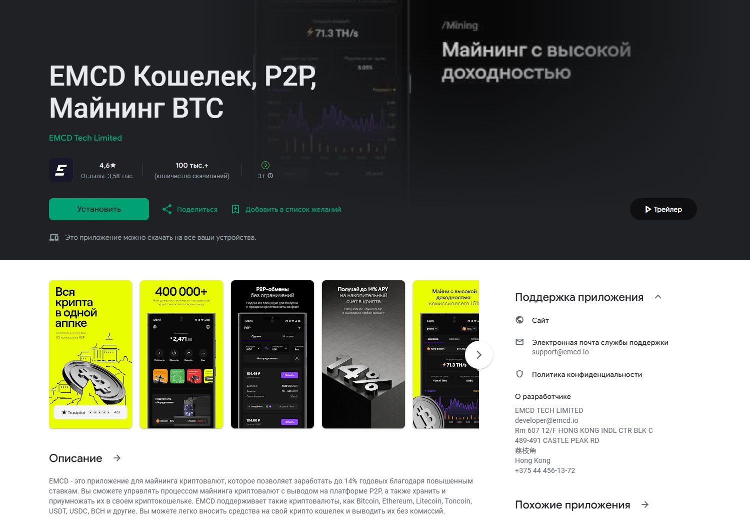 На сайте не размещается информации о компании, которая стоит за пулом. Контактные данные ограничиваются только email службы поддержки support emcd io. Зато узнать информацию о компании-разработчике можно в магазинах приложений. Речь идет о компании из Гонконга EMCD Tech Limited: