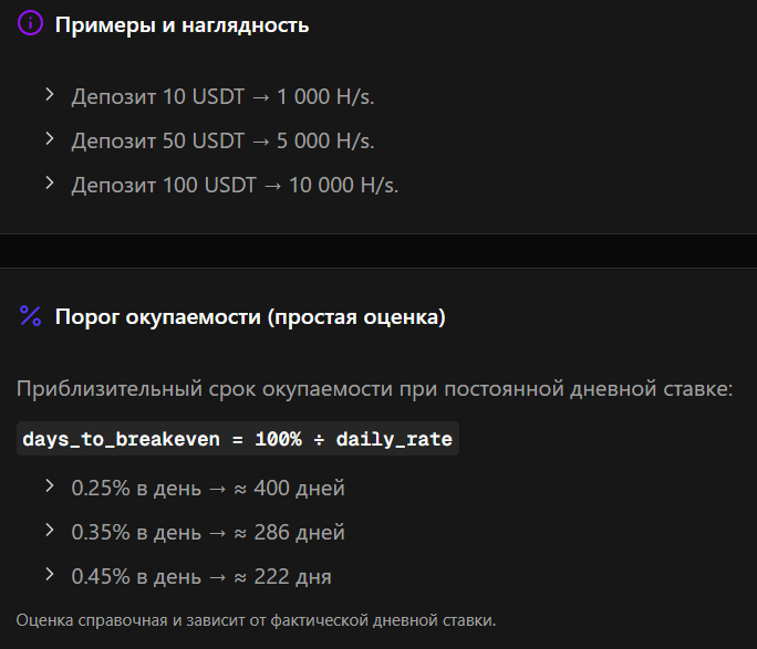 Минимальный депозит на платформе составляет $10, деньги принимаются только в криптовалюте. При базовом депозите клиенту обещают прибыль в 0,25% в день. При депозите от $100 можно рассчитывать на 0,45% ежедневно. Клиентов предупреждают, что доходы плавающие, а клиент будет получать от платформы долю прибыли, пропорциональную своему вкладу.
