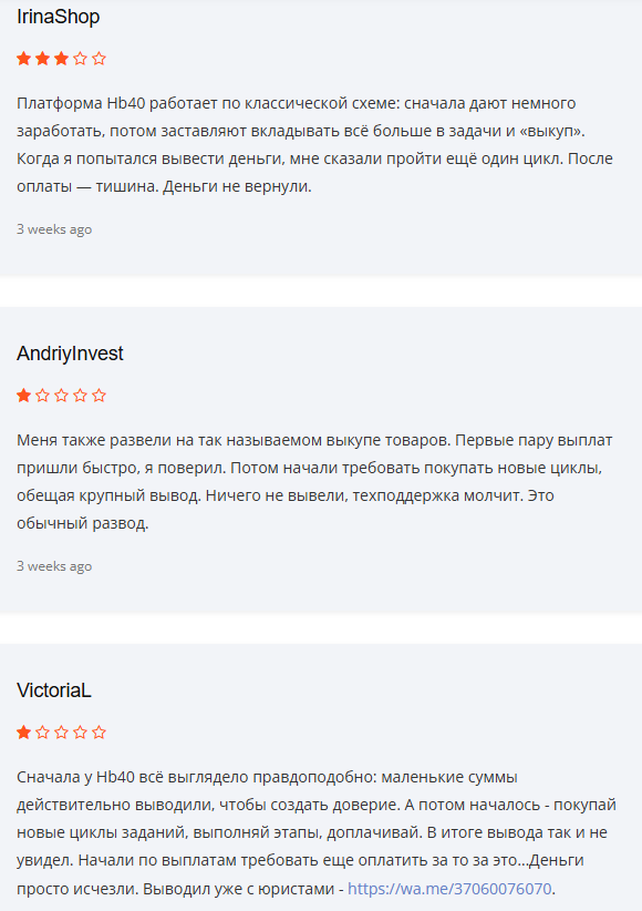 Отзывы о hb40 com от клиентов крайне негативные. Основная проблема – блокировка вывода денег. Схема обмана у всех одинаковая. Сначала платформа выводит 200–280 рублей без задержек. Это быстро и без проблем. Человек начинает доверять проекту. Психологический барьер снят.