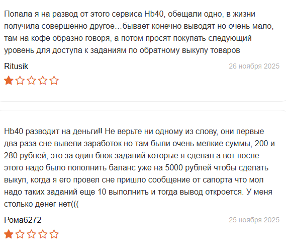 Платформа hb40 com обещает заработок на заданиях по выкупу товаров. Мы проверили проект после волны жалоб на блокировку выводов. Пользователи сообщают о постоянных требованиях новых вложений. В обзоре разберем условия работы и реальный опыт клиентов сервиса.