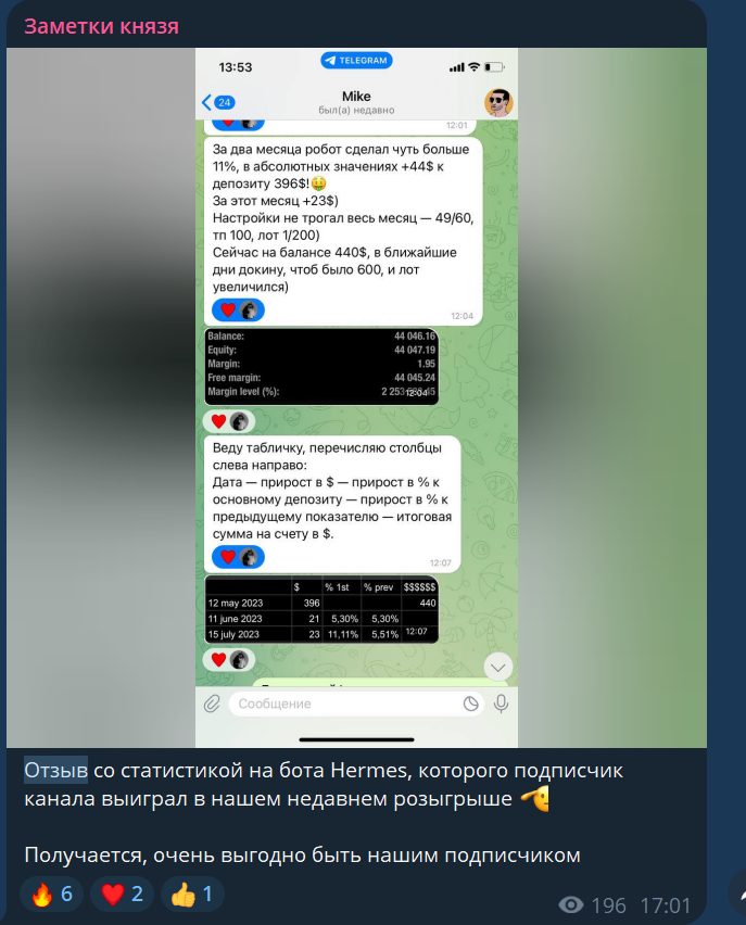 Hermes – это торговый советник, которого продают в тг-каналах под видом пассивного дохода 200-300% годовых на паре XAU/USD. Сообщество knyaz_notes и администратор bernazkiy его продвигают с 2023 года через посты и скрины прибыли. На деле это сомнительная схема, которая рассчитана на доверчивых участников. В этой статье мы разберем суть программы и выясним, стоит ли ей доверять.