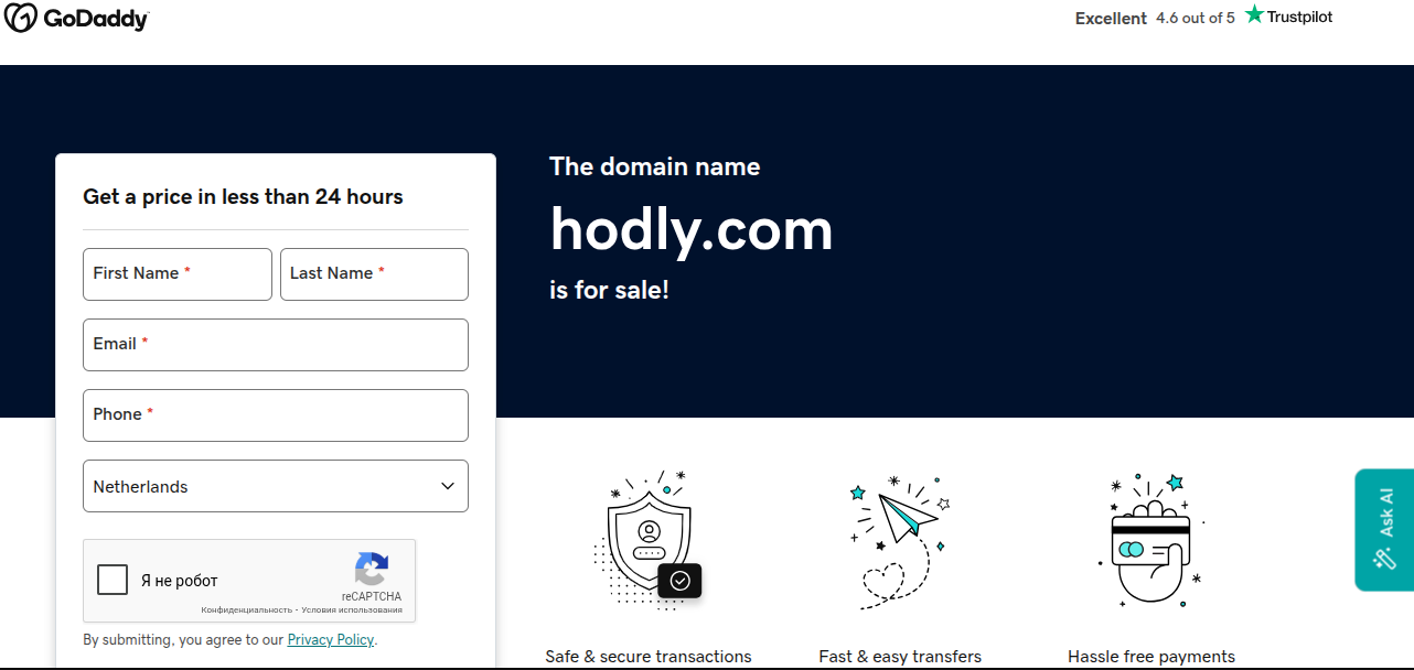 Однако преимущества теперь уже только «на бумаге». Из реального положения дел отметим отсутствие работающего сайта. Мы перешли по ссылке на кошелек Hodly com и получили предупреждение о продаже домена.