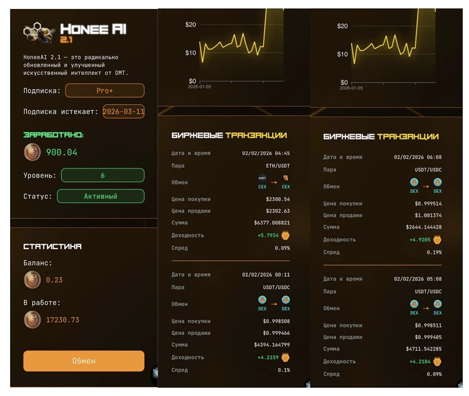 HoneeAI представляет собой торгового советника с ИИ. Но это не привычный бот, который открывает ордера на споте или фьючерсах. ПО работает в сфере арбитража криптовалют.