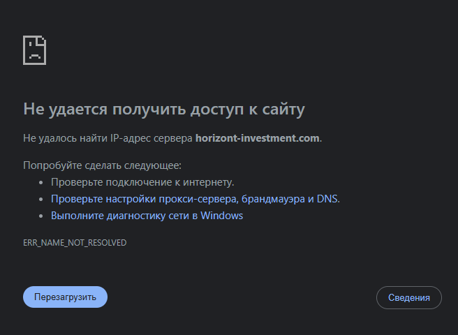 Проблемы начинаются уже при попытке ознакомиться с официальным сайтом Horizont Investment Com. Он недоступен на момент написания материала и непонятно, будет ли вообще возобновлена работа.