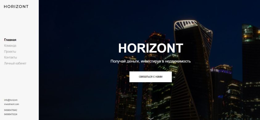 Horizont Investment – это якобы быстро развивающаяся инвестиционная компания. Проект предлагает инвестиции в недвижимость под высокий процент, а создатели уверяют, что все выплаты производятся честно и без задержек. У организации даже есть офис в Москве, что может вызвать доверие. Тем не менее спешить к сотрудничеству с площадкой не стоит, поскольку здесь есть немало и подозрительных моментов.