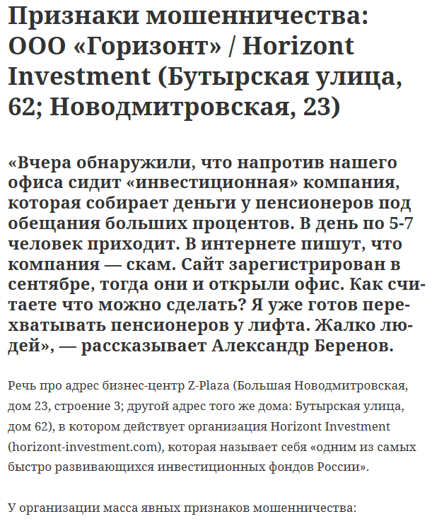В интернете можно найти немаленький текст о том, что в Горизонт Инвестментс обманывают клиентов, в основном пенсионеров, которых предварительно обзванивают. Во время разговора жертве внушают, что все надежно и очень прибыльно.