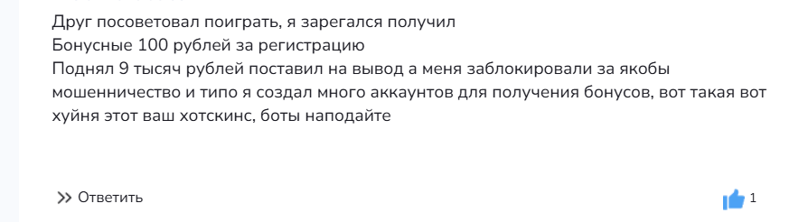 Игра «Хотскинс» отзывы получила преимущественно отрицательные, если рассматривать внешние источники. Люди пишут, что им по разным причинам не давали вывести деньги. Указывались, что пользователь нарушил правила, является ботом, приглашал рефералов, а не играл и прочие выдуманные отказы. Жалобы в ТГ Hotskins не помогали решать эту проблему и люди оставались без денег.